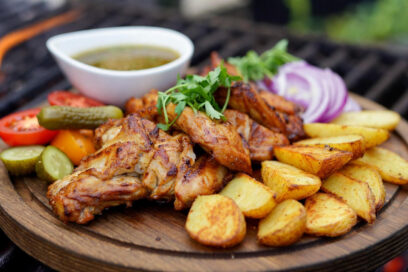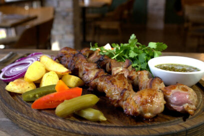 $26Tender marinated chicken pieces grilled over open flame, served with pan-fried potatoes, vegetable pickles, red onions, and traditional Georgian tkemali sauce.