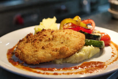 $27Crispy chicken cutlet coated in golden croutons and grilled to perfection. Served with creamy mashed potatoes, grilled vegetables, and the chef’s special tomato-based sauce.