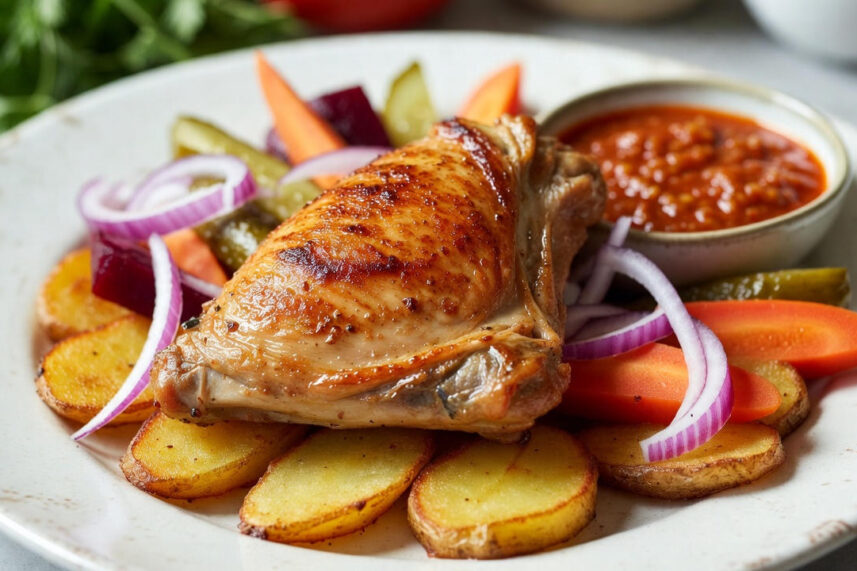 Juicy grilled chicken thigh served with pan-fried potatoes, vegetable pickles, red onions, and traditional Georgian tkemali sauce.