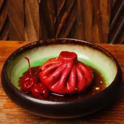 A warm dessert filled with lightly sweetened farmer’s cheese, topped with rich cherry sauce and whole cherries inside. Served hot with a drizzle of cherry juice for the perfect sweet finish.