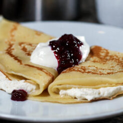 Delicate crepes filled with lightly sweetened farmer’s cheese, served warm with sour cream and fruit preserves.