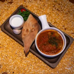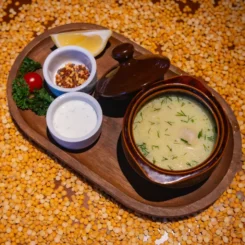 Mini Chicken dumplings served in clay pot. Served with garlic-sour cream broth.