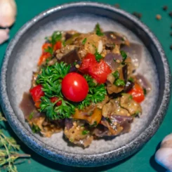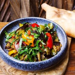 Fire-roasted eggplant, peppers, green beans, onions with garlic and fresh herbs.