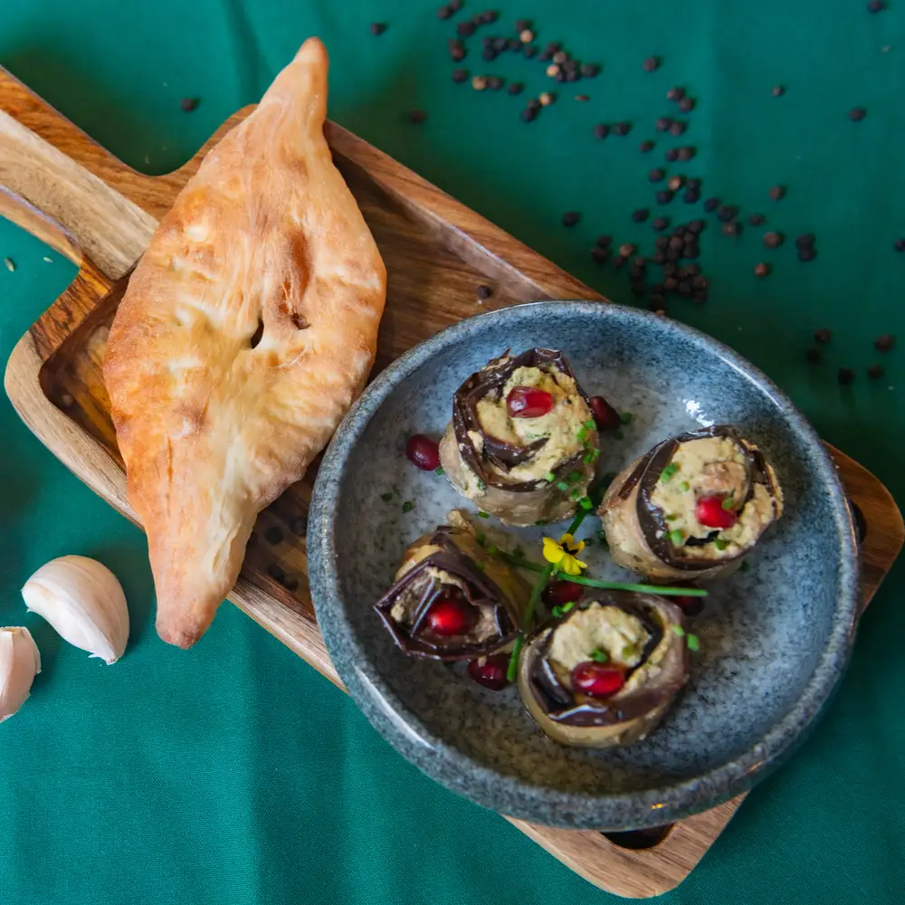 Fire-roasted eggplant wrapped with roasted onions, garlic, coriander, cilantro, pomegranate, walnut dressing