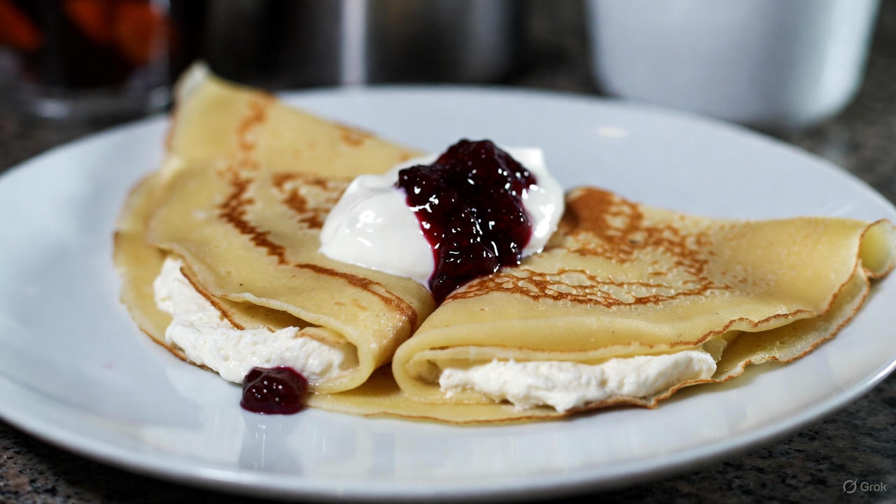 Delicate crepes filled with lightly sweetened farmer’s cheese, served warm with sour cream and fruit preserves.