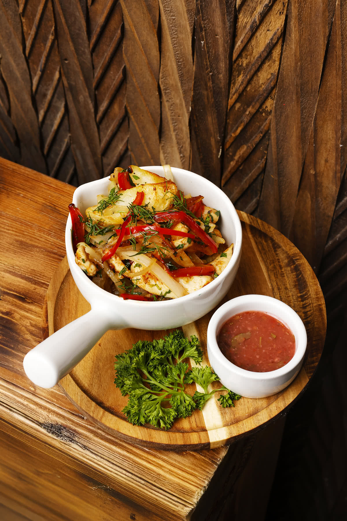 Crispy, golden fried potatoes tossed with aromatic spices, onions, and fresh herbs. (+$5 Mushroom/Chicken)